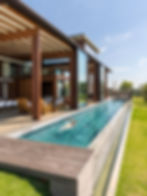 The two-lane swimming pool connects the facade overlooking the golf course by creating an interaction between the inside and the outside and transforms the living room into a great covered terrace once set up against the glass curtain wall that makes up this facade.